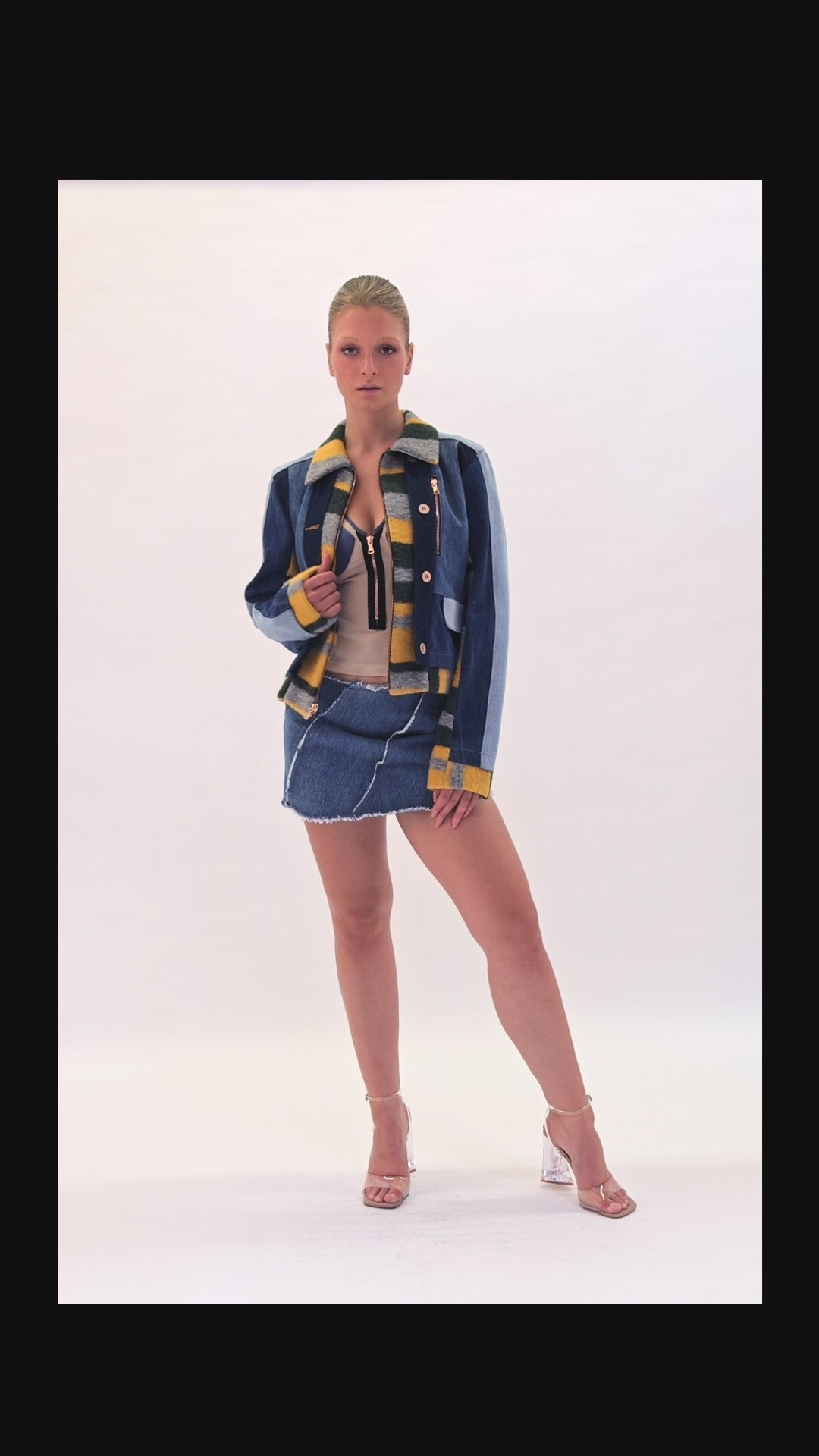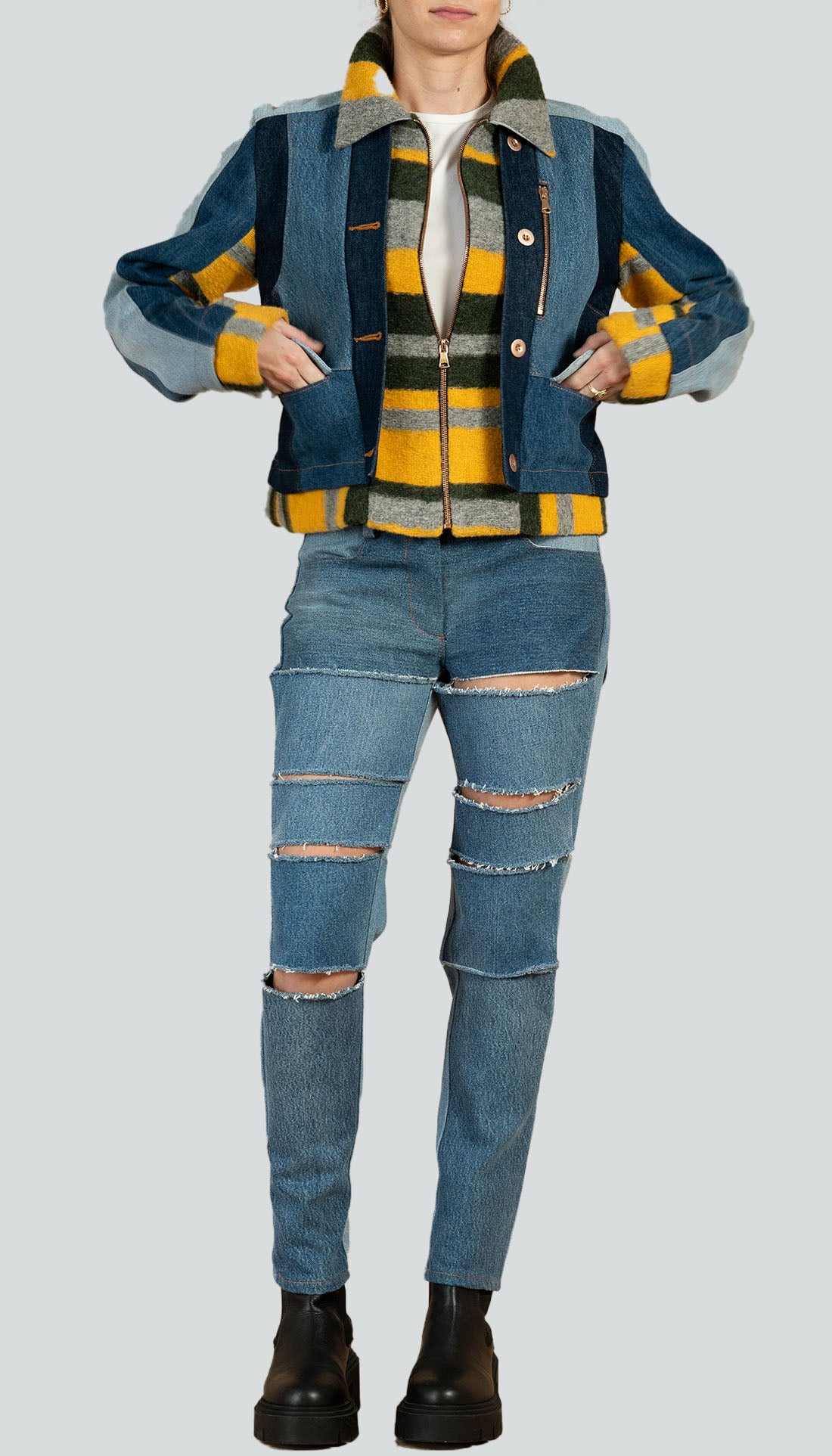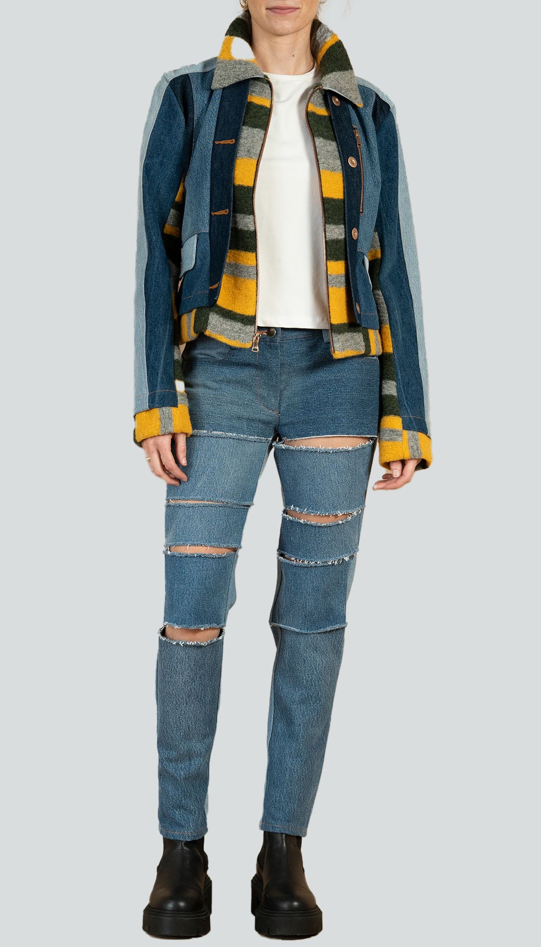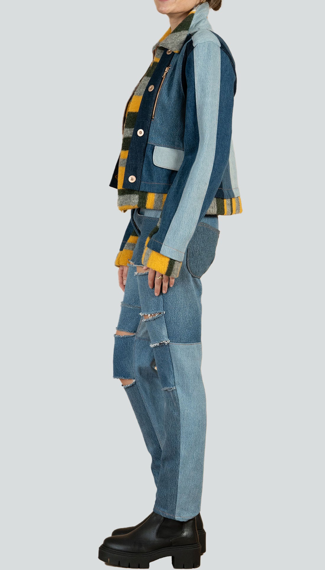 Trompe l'oiel jacket made with recycled denim, featuring an underlayer made of wool. It has flap pockets on the front, decoratif buttons and a center front zipper.