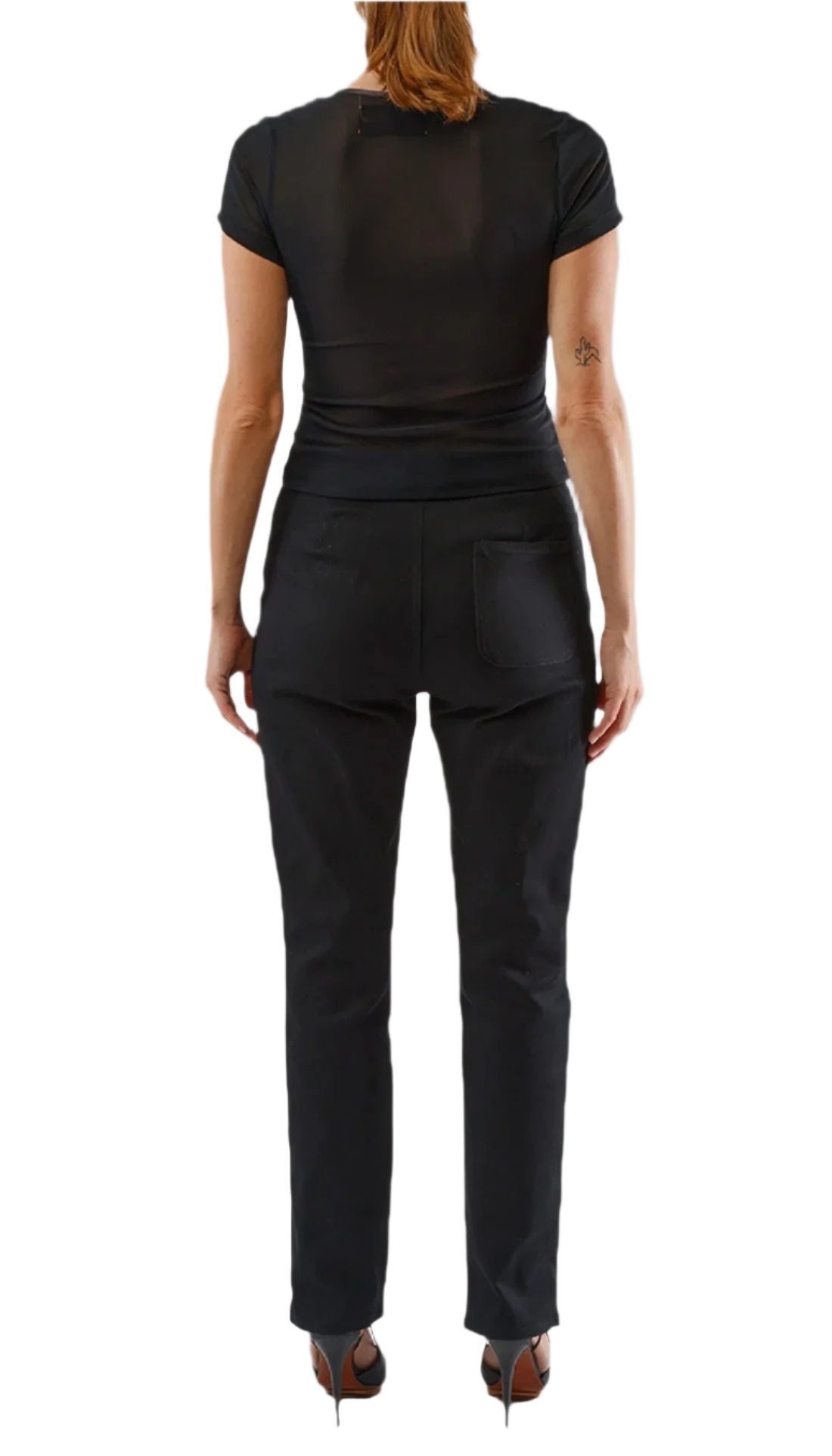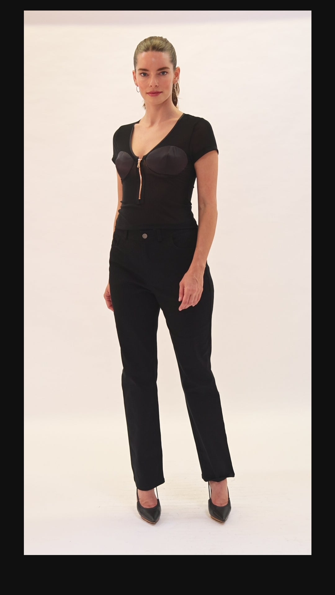 The Jess top is a highly breathable and comfortable top for any occasion. It is a V-neck made of mesh with silk bra shapes. It features a functional zipper at the center front.