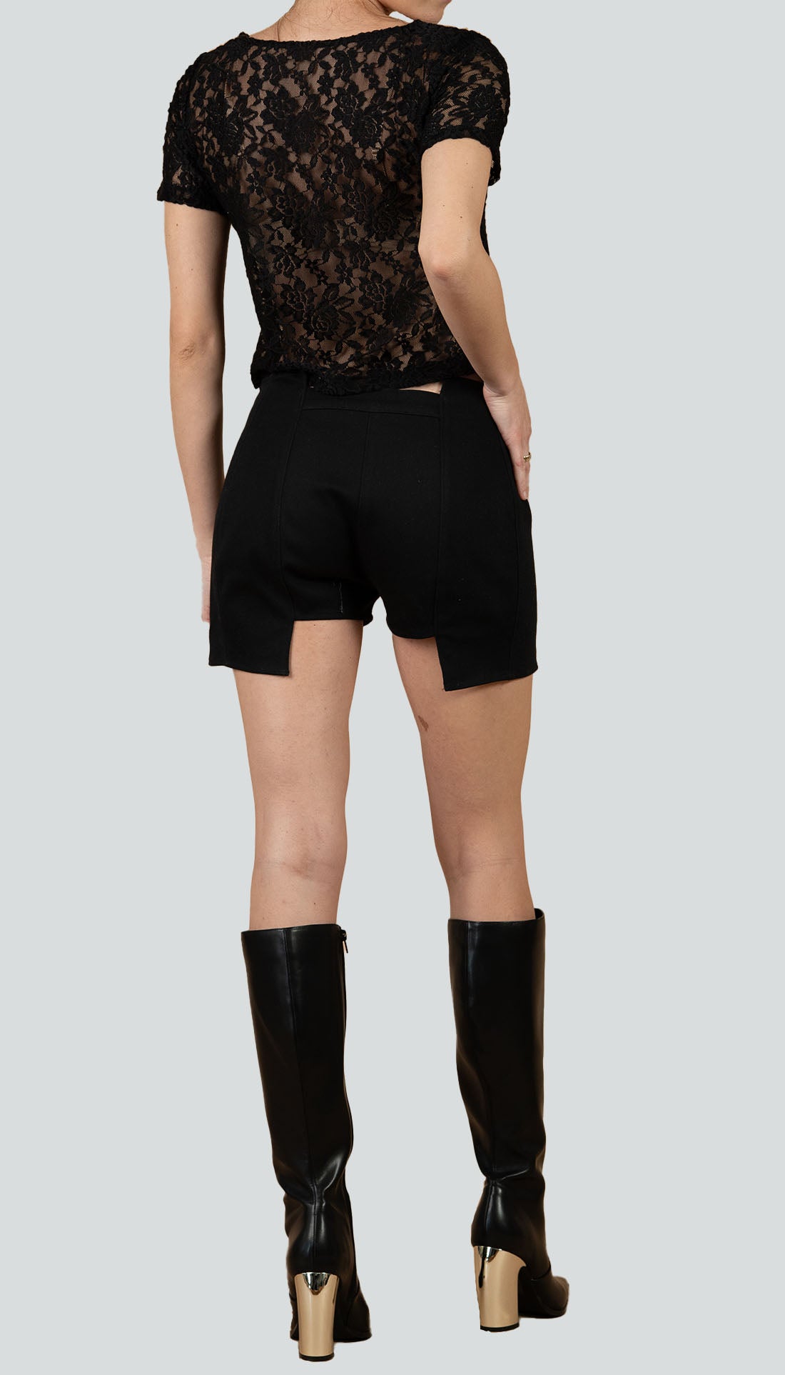 The Jess top is a highly breathable and comfortable top for any occasion. It is a V-neck made of mesh with silk bra shapes. It features a functional zipper at the center front.