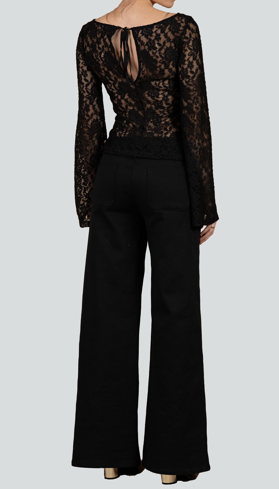 Amelia top is a lace long belle sleeve. Boat neck. Very versatile piece to dress up or a casual day.